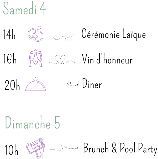 Vous êtes conviés à certaines parties du week-end. N’hésitez pas à vous référer à votre invitation personnalisée ou à nous demander si vous avez un doute ! On a hâte de partager ce moment avec vous. 💜